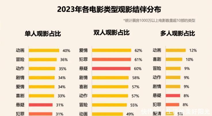 在悬疑犯罪片中,工具价值是什么呢?一则非常有趣的数据是,在2023年各电影类型观影结伴分布中,悬疑犯罪片在单人和多人观影占比中均处于低位,只有在双人观影占比中排名前列。