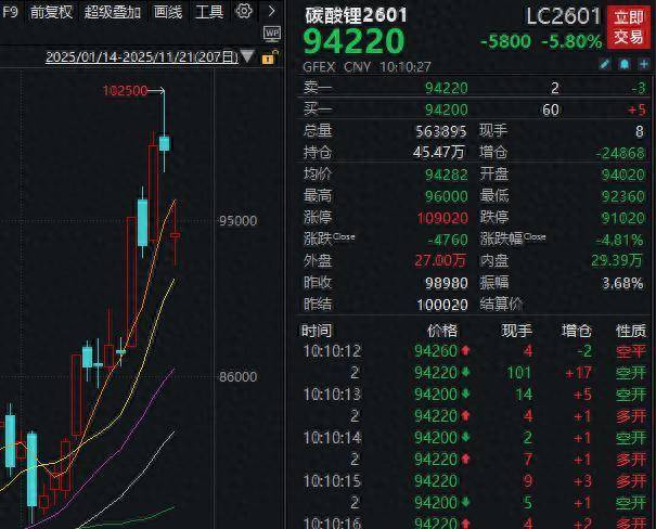 【大河财立方消息】11月21日最靠谱股票配资平台,碳酸锂主力合约跳空低开。截至发稿,碳酸锂2601合约跌幅达5.80%。