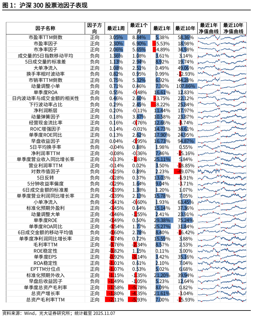 沪深300股票池中,本周表现较好的因子有市盈率TTM倒数(3.05%)、市盈率因子 (2.30%)、市净率因子(2.06%)。表现较差的因子有总资产毛利率TTM (-2.11%)、总资产增长率(-1.80%)、单季度总资产毛利率(-1.58%)。