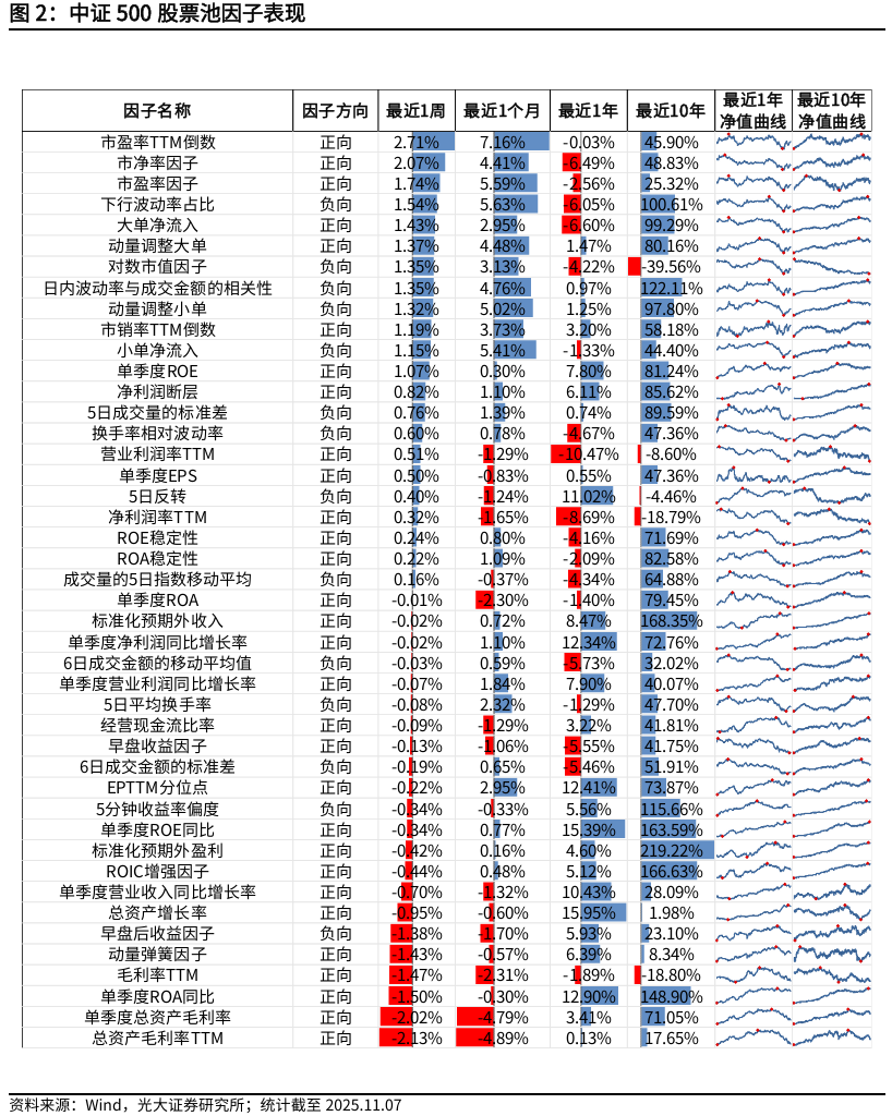 中证500股票池中,本周表现较好的因子有市盈率TTM倒数(2.71%)、市净率因子(2.07%)、市盈率因子(1.74%)。表现较差的因子有总资产毛利率TTM (-2.13%)、单季度总资产毛利率(-2.02%)、单季度ROA同比(-1.50%)。