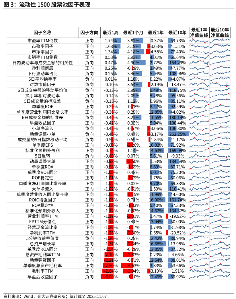 流动性1500股票池中,本周表现较好的因子有市盈率TTM倒数(1.74%)、市盈率因子(1.68%)、市净率因子(1.34%)。表现较差的因子有早盘后收益因子 (-3.00%)、毛利率TTM (-2.64%)、单季度总资产毛利率(-2.50%)。