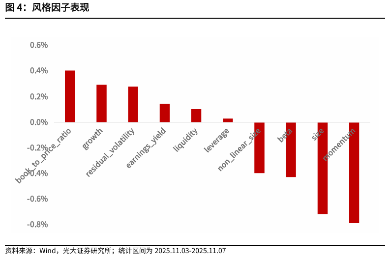本周全市场股票池中,估值因子获取正收益0.40%;市值因子、非线性市值因子分别获取负收益-0.72%、-0.40%,市场表现为小市值风格;动量因子和Beta因子分别获取负收益-0.79%、-0.43%,市场表现为反转效应;其余风格因子表现一般。