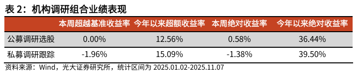 本周私募调研跟踪策略获取负超额收益。公募调研选股策略相对中证800获得超额收益0.00%,私募调研跟踪策略相对中证800获得超额收益-1.96%。