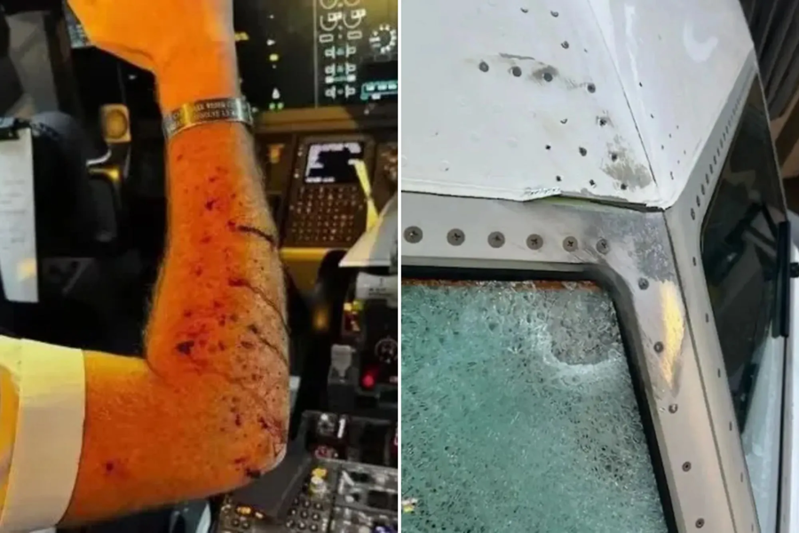 △机长手臂受伤(左),驾驶舱风挡玻璃受损(右)